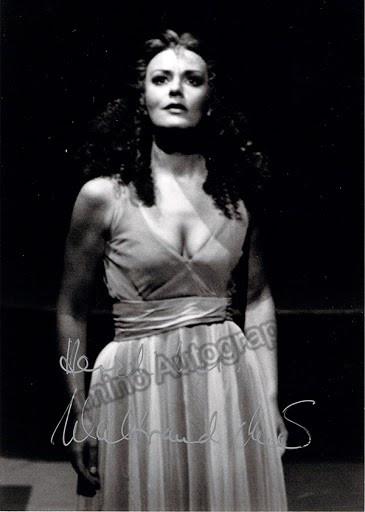 Signed photo of the star German mezzo-soprano (b.1956), shown in one of her signatures roles: Kundry in Wagner's Parsifal, dated in 1990 at Bayreuth Festival. Size 4 x 5.75 inches.