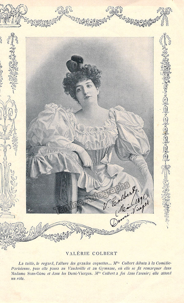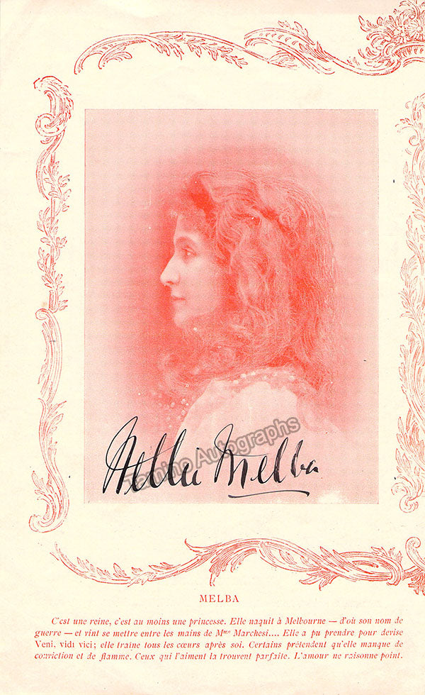 Signed two- sided print containing portrait-style photographic images of Nellie Melba the Star Australian soprano (1861-1931) on one side and her contemporary Valerie Colbert on the other. Both have signatures at the bottom of the image. Size is 6 x 9.75 inches, in very good condition.