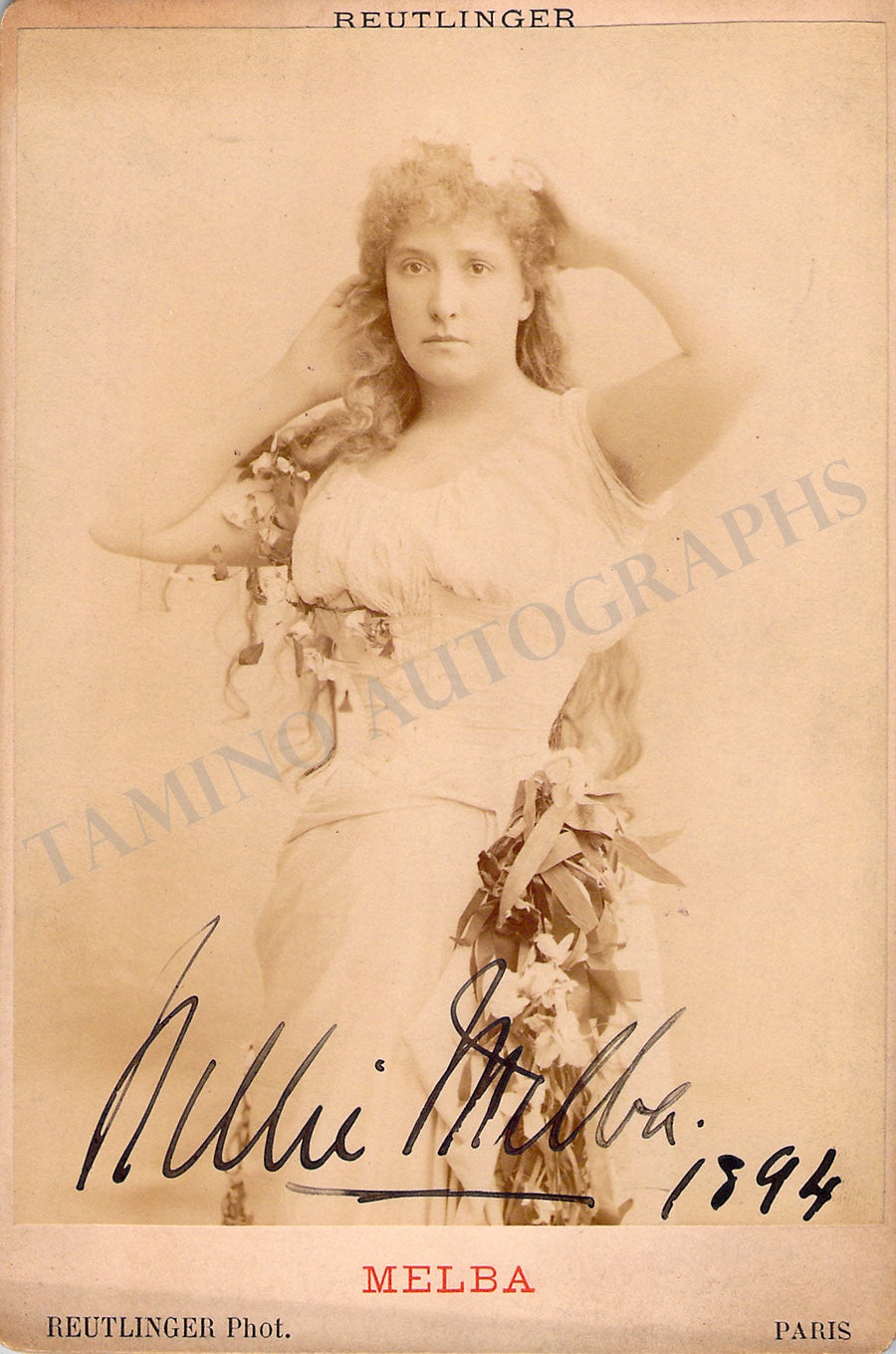 Superb, extra large photograph of her as Elisabeth in Tannhauser, signed below by her, over the photographer mat, and dated in Boston in 1894. Photo is inscribed to the famous Hotel Vendome in Boston, where she used to stay, and was proudly exhibited in one of the hotel hallways for many years. Above her signature, Melba wrote, in French, a short sentiment: 'In remembrance of a charming stay, to the Hotel Vendome'. Size is slightly larger than 18 x 23 inches, it is currently framed, but is sold unframed. This is the largest Melba autograph we have ever seen, and it is in great condition.