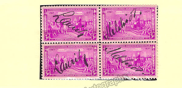 Set of 2 signed United States Constitution 1937 Sesquicentennial stamps (a double autograph) along with unsigned 8 x 10 inch photo in role, likely Wagner's Siegfried.  Both in excellent condition, not sold separately.
