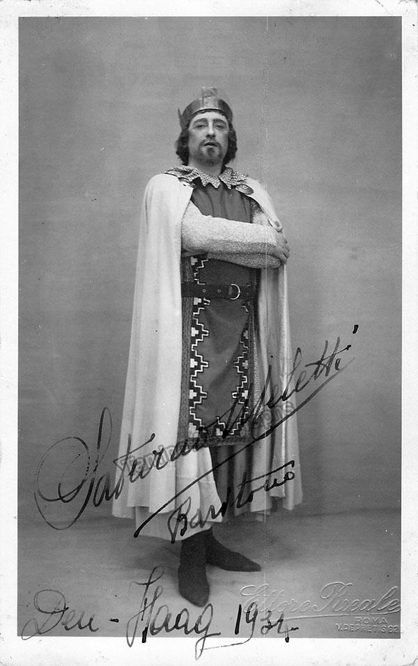 Italian bass-baritone (1906-1985), signed photo postcard, shown in role, dated 1934. Blind stamped by photographer Ettore Reale, Rome. Size is 3.5 x 5.5 inches, some wear on edges but otherwise in very good condition.
