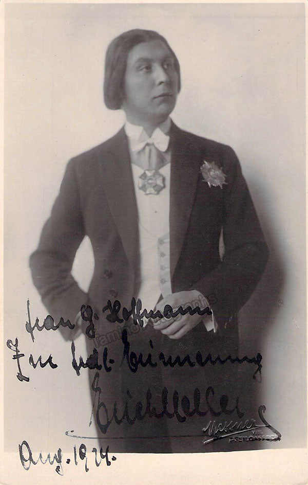 Austrian pianist (1890-1941), signed postcard photograph, inscribed and dated in 1924. Blind stamped on front by photographer Messner. Size is 3.25 x 5 inches, in excellent condition.