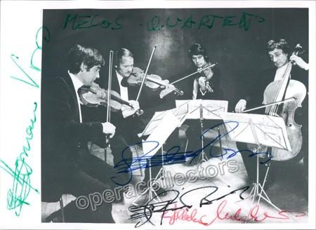 The Melos Quartet, also called the Melos Quartet Stuttgart, is a German string quartet musical ensemble based in Stuttgart, that was in existence from 1965 to 2005. Photo size 7 x 5 inches. Signed by all four members.