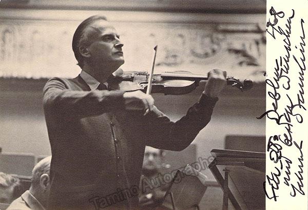 American violinist and conductor (1916-1999), considered one of the greatest violinists of the 20th century. Gorgeous signed photo taken in performance, inscribed. Size is 5.75 x 3.9 inches, in excellent condition.