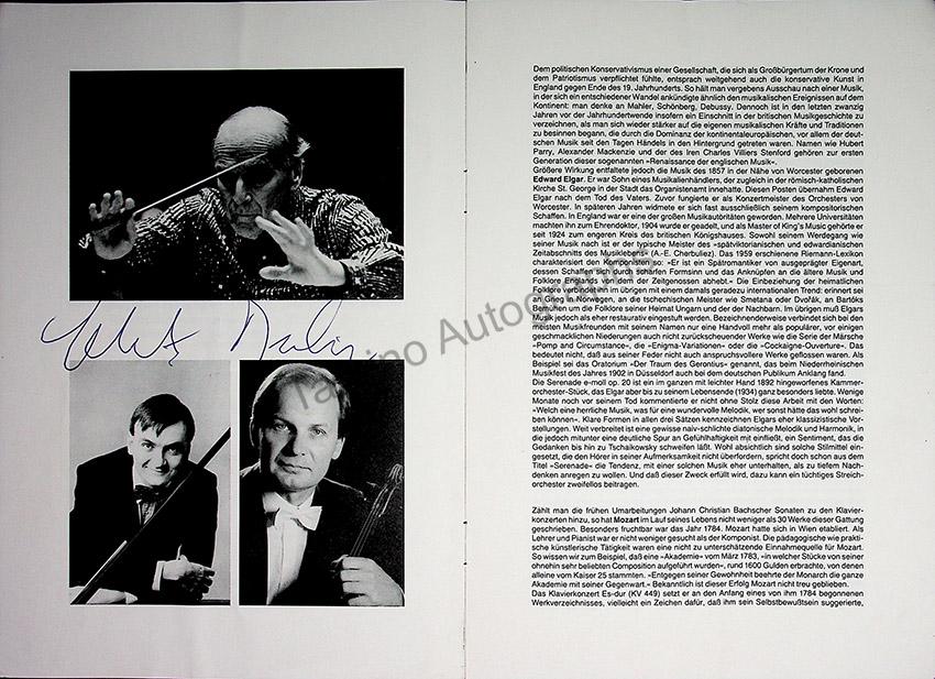 Program for a performance of the English Chamber Orchestra in Cologne, Germany, 1989, under the baton of Sir Yehudi Menuhin. signed by him under his photo on page 2.  Size is 5.25 x 9.75 inches, full program with all pages and covers, in excellent condition.