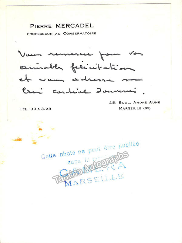 French operetta baritone and voice teacher, signed publicity photograph, shown as himself, inscribed. Additional handwriting on verso. Stamped on verso by Camera photo studio, Marseille. Size is 4 x 5.5 inches, very slight paper loss on edges, otherwise in very good condition.