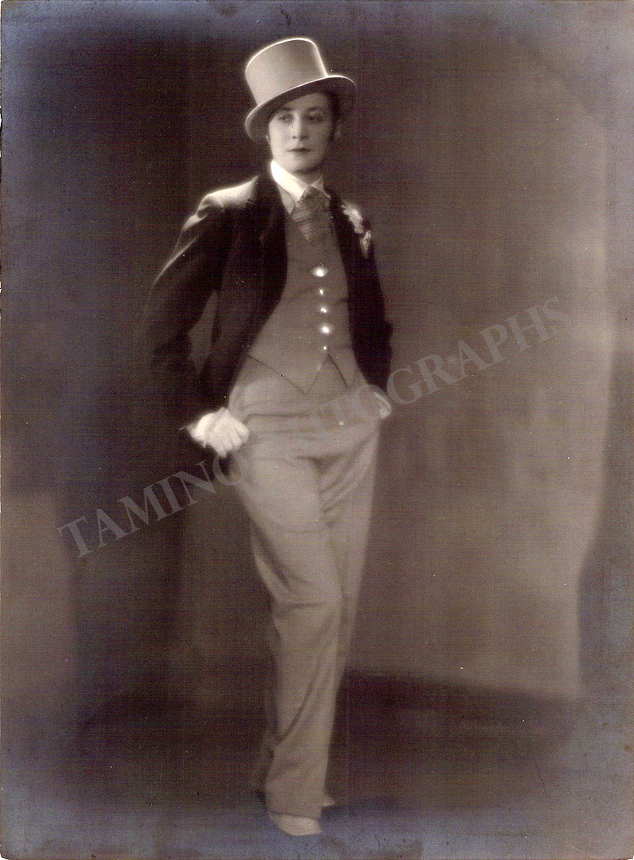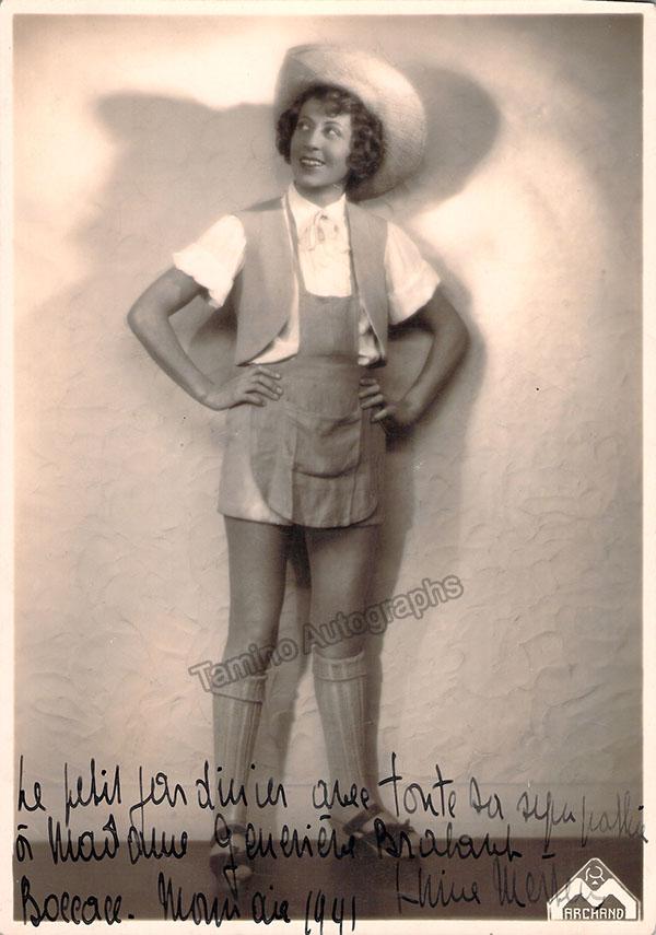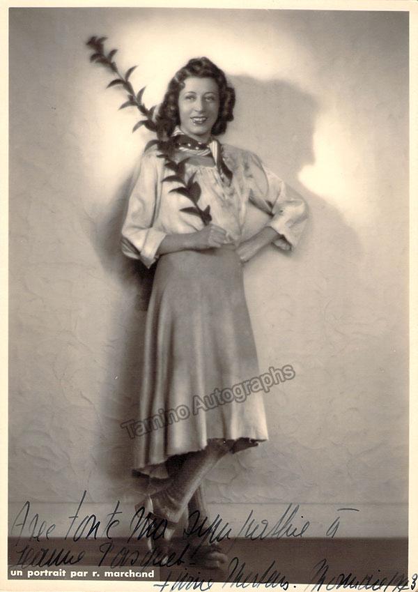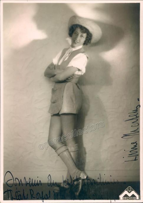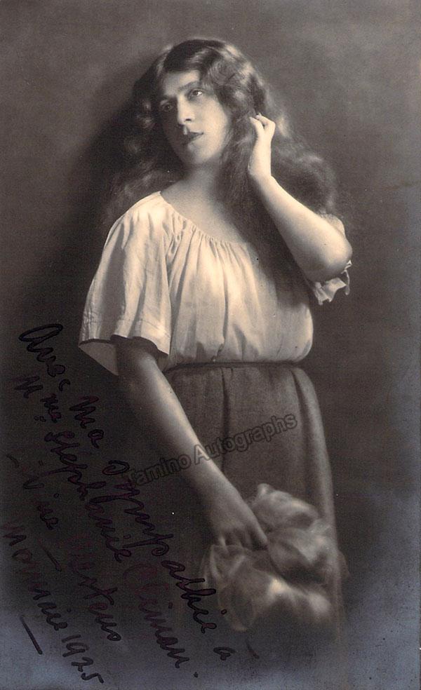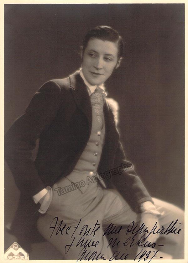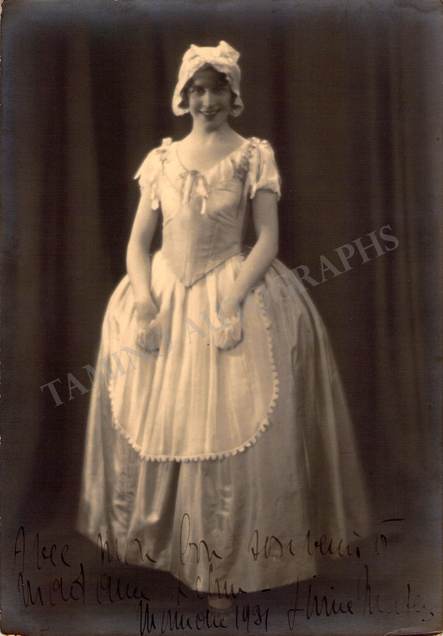 Black-and-white photograph signed and inscribed by her with a short sentiment, dated at La Monnaie (Brussels) in 1931, shown in André Messager's opera 'La Basoche'; ink-stamped on verso by photograph R. Marchand. Size is 6.1 x 8.75 inches, silvering over the borders, otherwise in excellent condition.