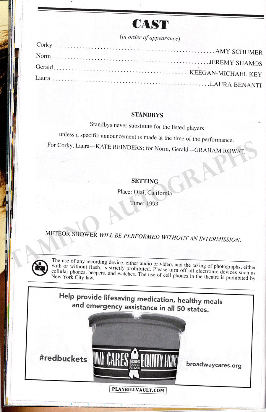 Original playbill for a Broadway production of the musical Meteor Shower at the Booth Theatre, featuring Amy Schumer, Jeremy Shamos, Keegan-Michael Key, and Laura Benanti; signed by Amy Schumer.