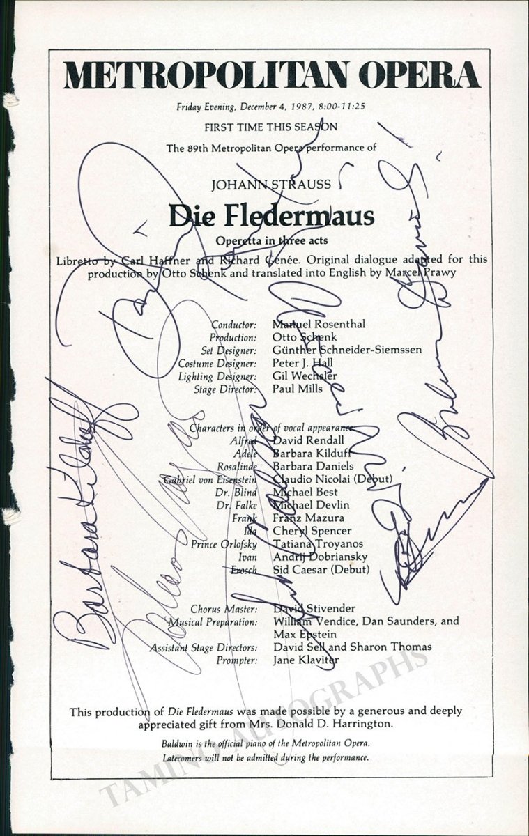 Cast page from a performance of Johann Strauss II's Die Fledermaus in 1987 signed by all the above mentioned singers plus Claudio Nicolai, Sid Caesar and Barbara Kilduff