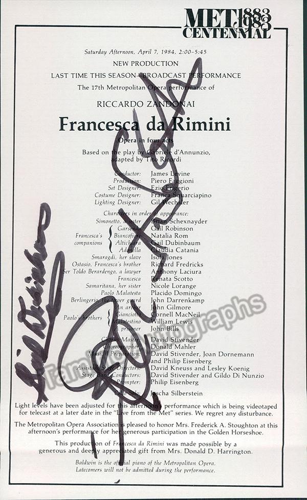 Cast page from a performance of Zandonai's Francesca da Rimini in 1984, signed by the above mentioned singers. Size is 5.5 x 9 inches.