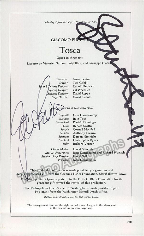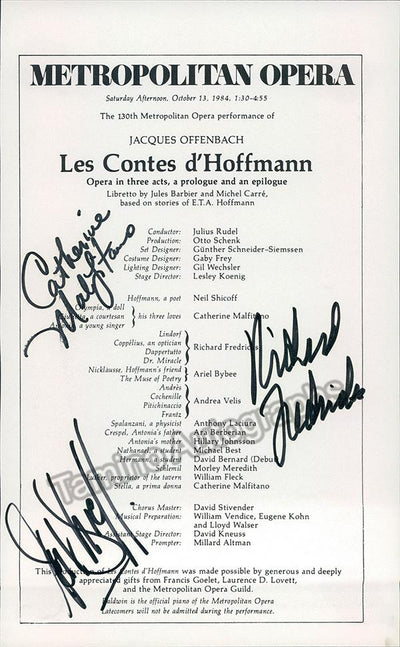 Cast page from a performance of Offenbach's Les Contes d'Hoffmann in 1984, signed by the above mentioned singers. Size is 5.5 x 9 inches.