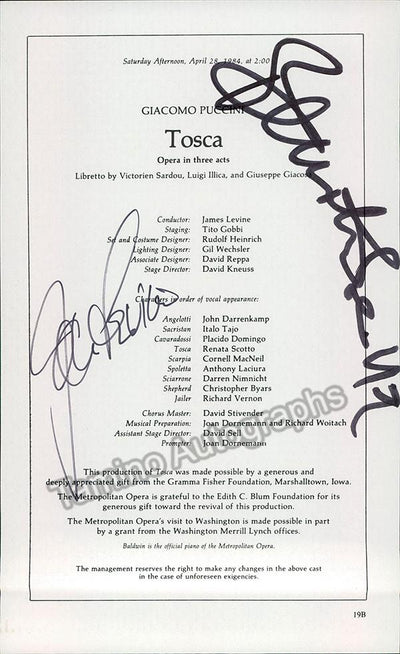 Cast page from a performance of Puccini's Tosca, signed by the famous Italian soprano and the celebrated American conductor.