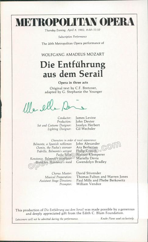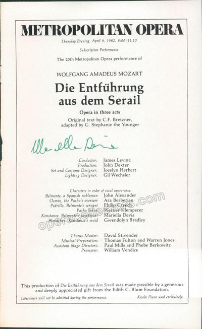Cast page from a performance of Mozart's Die Entfuhrung aus dem Serail, signed by the famous Italian soprano.