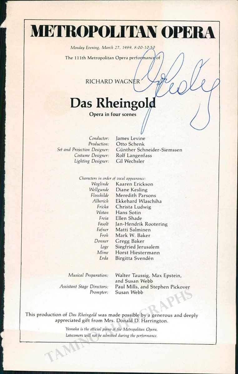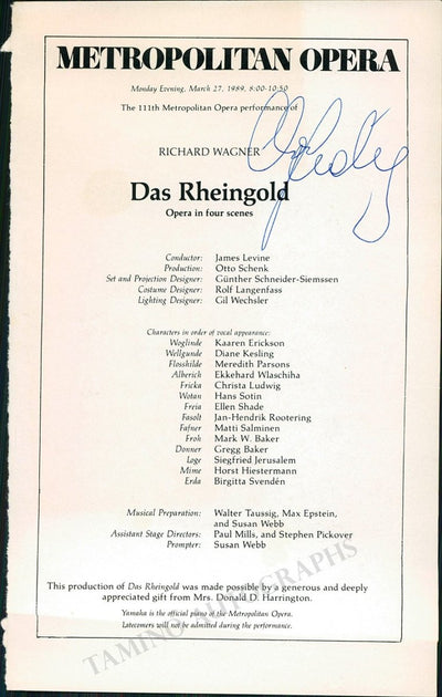 Cast page from a performance of Wagner's Das Rheingold in 1989 signed by the German mezzo-soprano.
