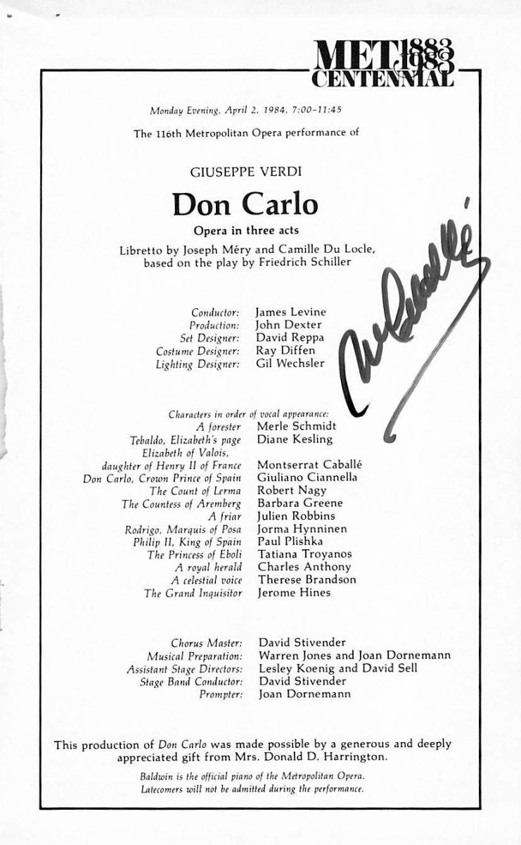 Cast page from a performance of Verdi's Don Carlo in 1984, signed by the star Spanish soprano.
