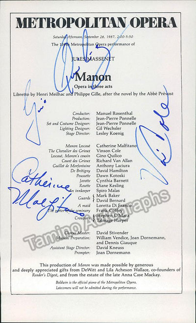 Cast page from a performance of Massenet's Manon in 1987, signed by the above mentioned singers. Size is 5.5 x 9 inches.