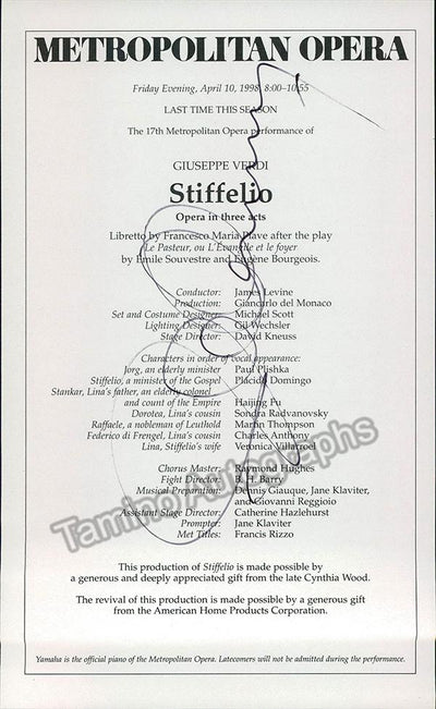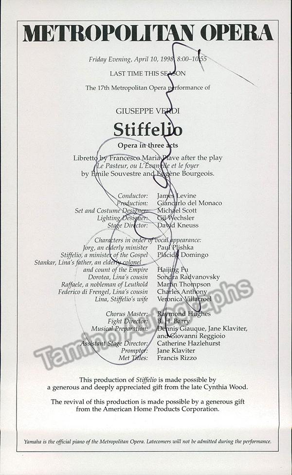 Cast page from a performance of Verdi's Stiffelio in 1988, signed by the celebrated Spanish tenor.
