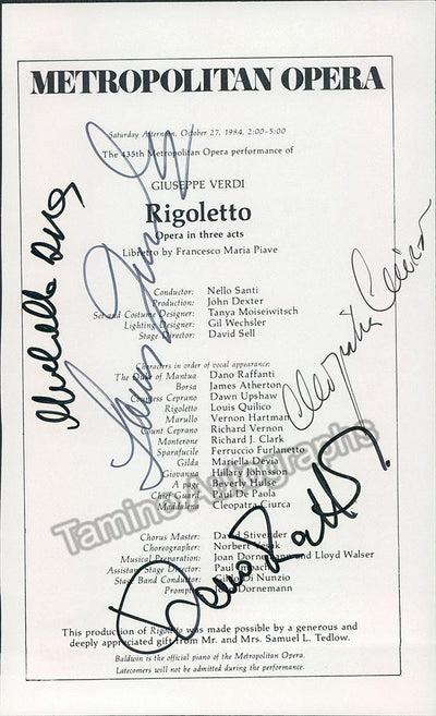 Cast page from a performance of Verdi's Rigoletto in 1984, signed by the above mentioned singers plus Cleopatra Ciurca. Size is 5.5 x 9 inches.