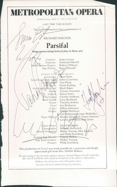 Cast page from a performance of Wagner's Parsifal in 1987, signed by the above mentioned singers plus other three unidentified signatures.