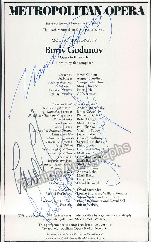 Cast page from a performance of Mussorgski's Boris Godunov in 1987, signed by the above mentioned singers plus two more unidentified signatures. Size is 5 x 8 inches.