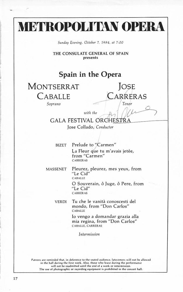 Program page from a recital entitled 'Spain in the Opera' in 1984 by star tenor Jose Carreras and star soprano Montserrat Caballe, with the Gala Festival Orchestra, signed by the Maestro Carreras.