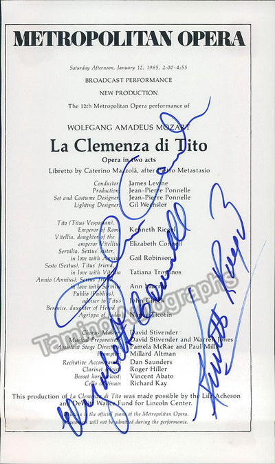 Cast page from a performance of Mozart's La Clemenza di Tito in 1985, signed by the above mentioned singers. Size is 5.5 x 9 inches.