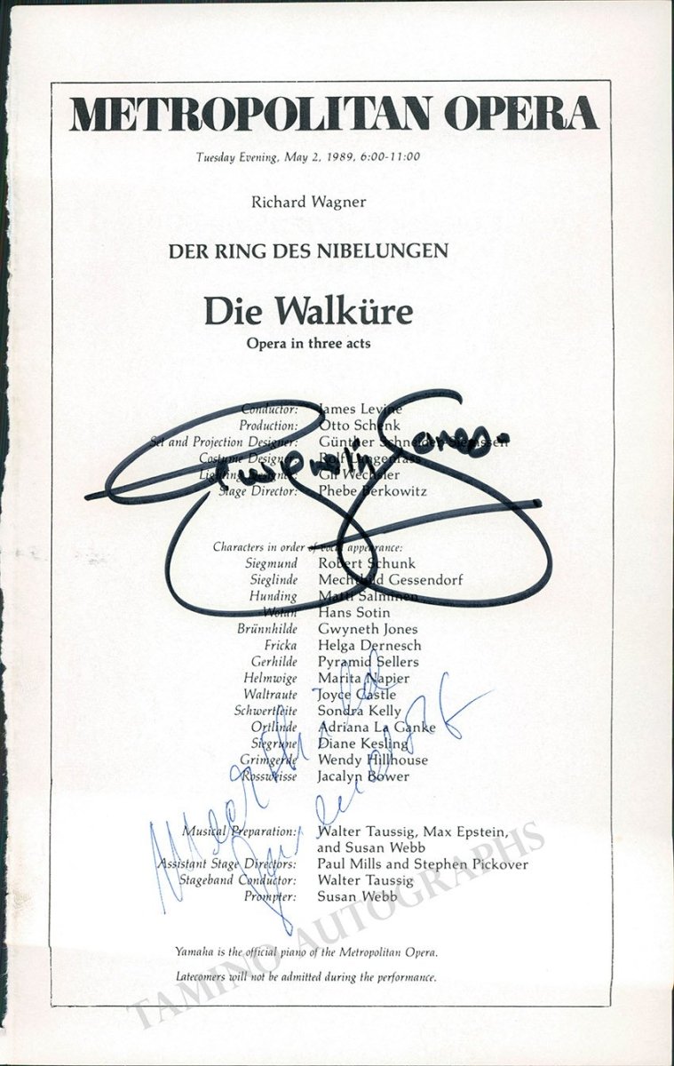 Cast page from a performance of Wagner's Die Walküre in 1989 signed by the two above mentioned singers.