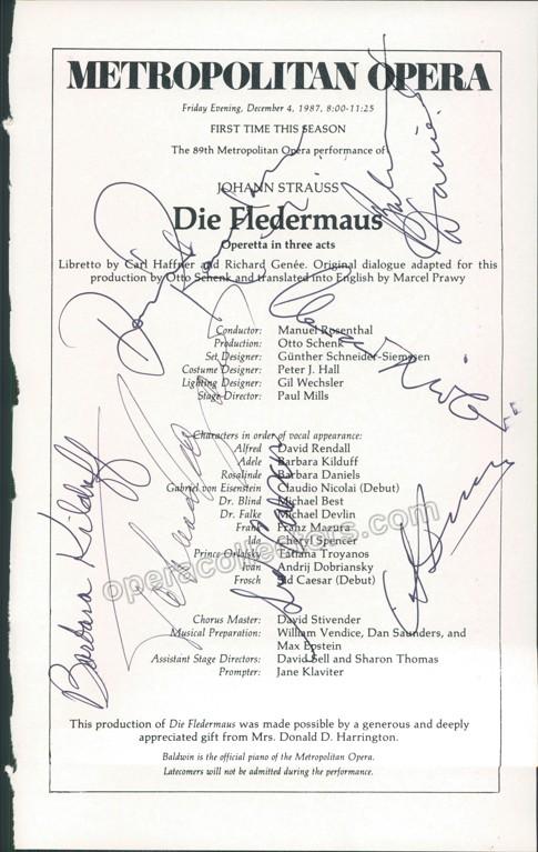 Cast page from a performance of Johann Strauss' Die Fledermaus in 1987, signed by the above mentioned singers plus Caesar Sid, Barbara Kilduff, David Rendall and one additional unidentified signature.