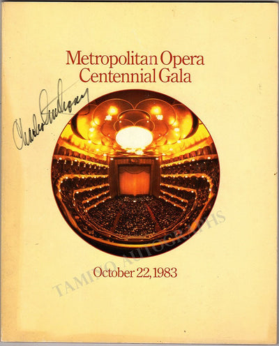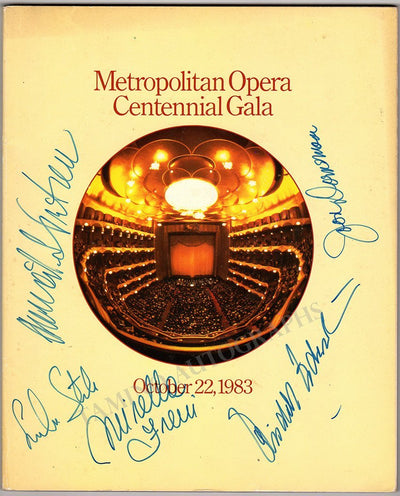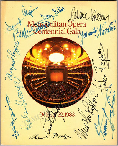 Program for the celebration of the Centennial of the Metropolitan Opera in 1983, signed by different artists. Each program is completed with all pages and covers, some articles, photos and some history. Size is 9 x 11 inches, in very good condition.