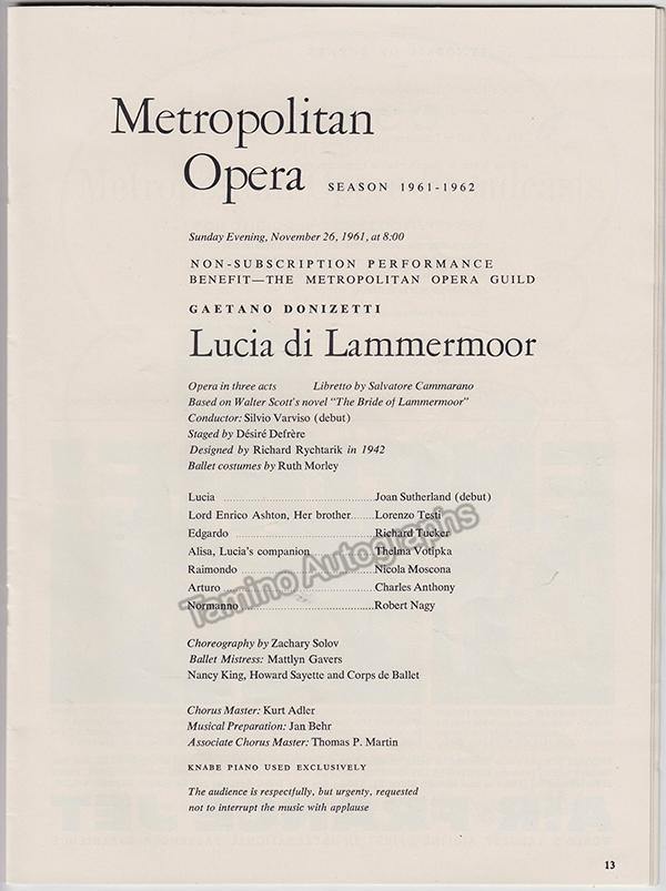 Complete program for a performance of Donizetti's Lucia di Lammermoor at the Metropolitan Opera House, New York, on November 26th, 1961, starring Joan Sutherland in the title role, marking her debut at that stage.  Size is 8 x 11 inches, full program with all pages and covers, in excelllent condition.