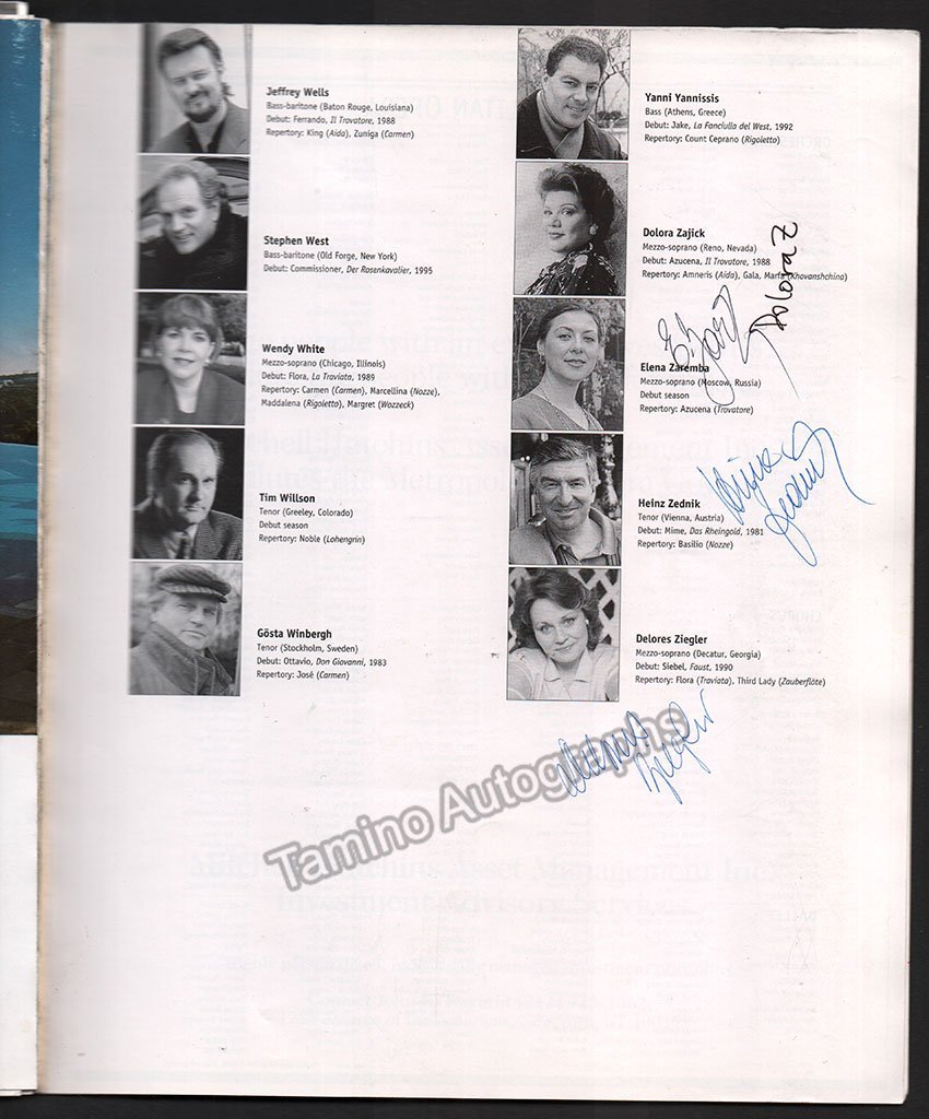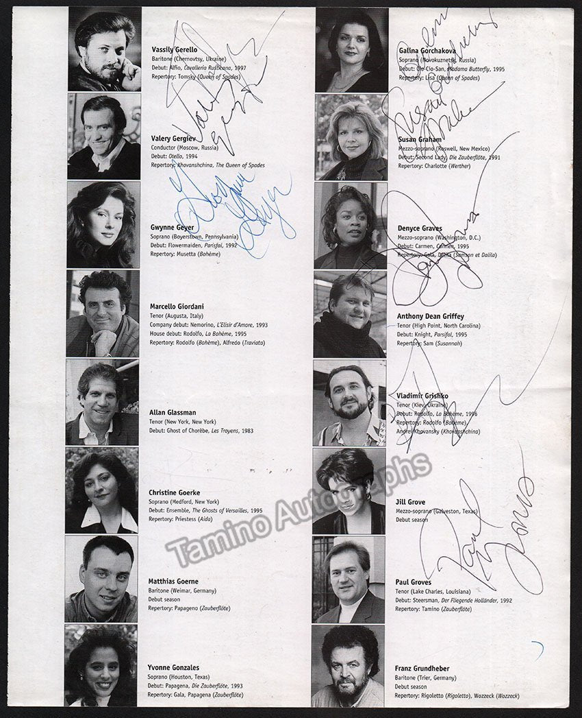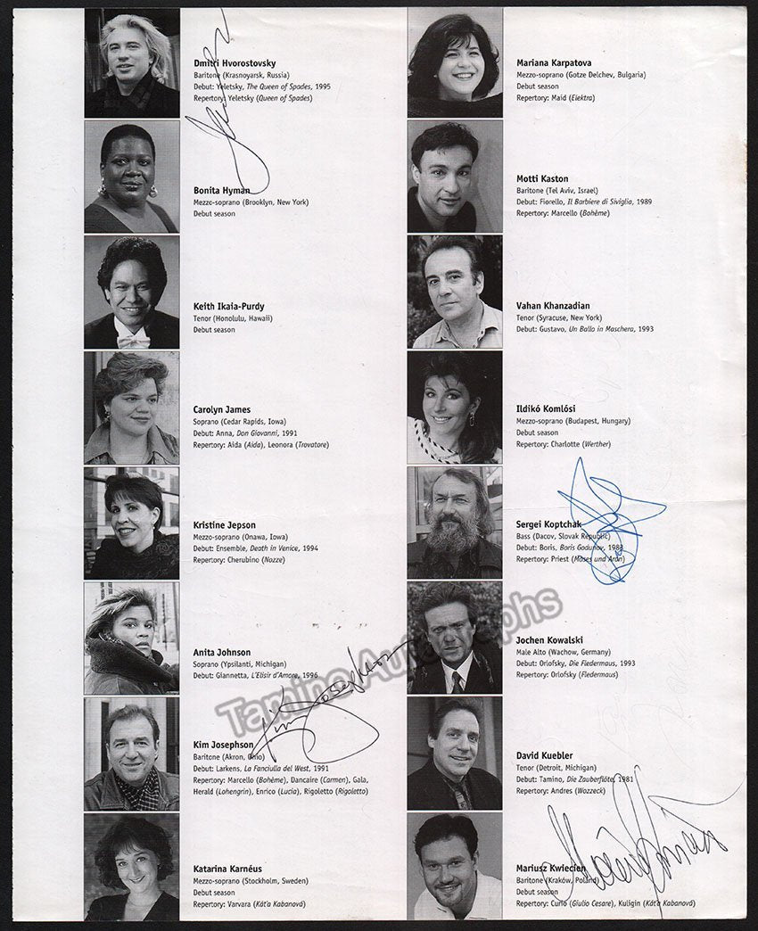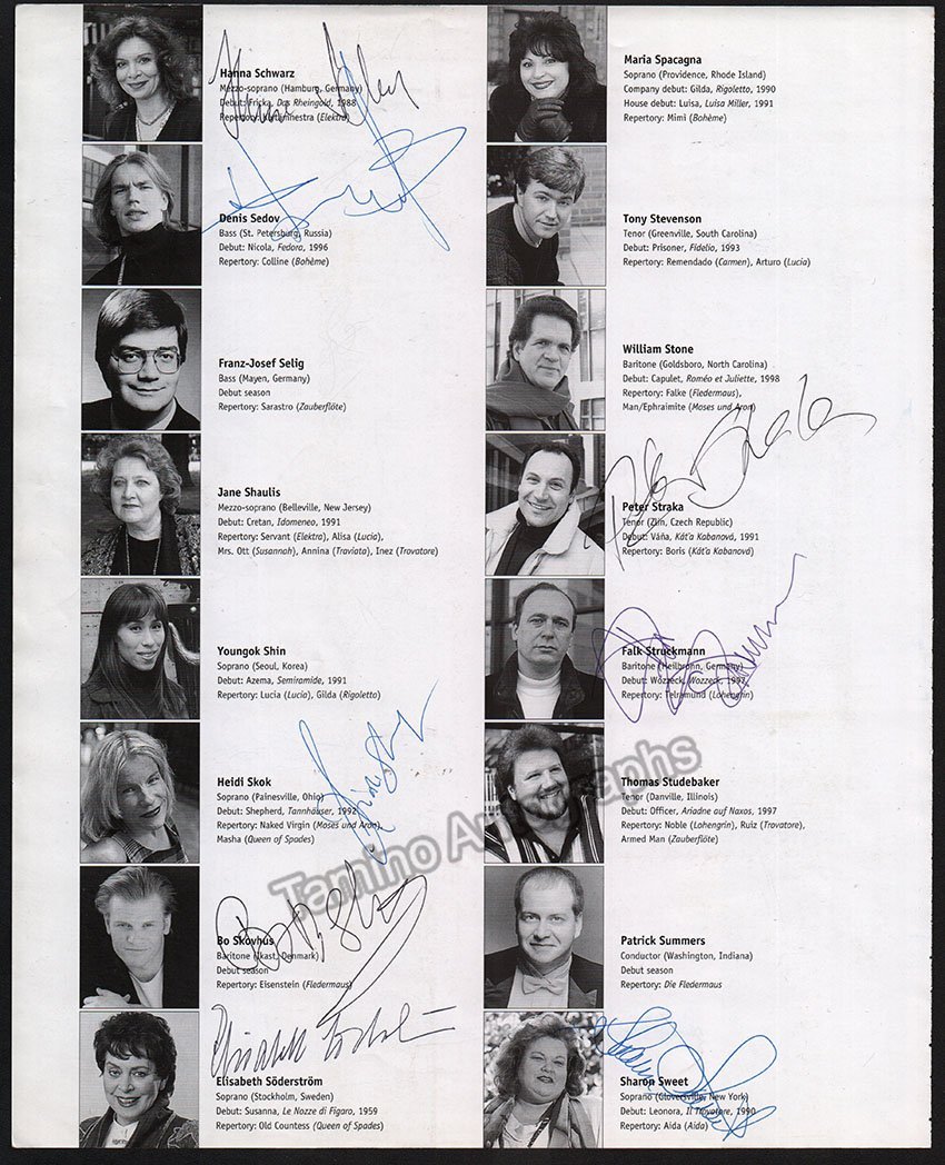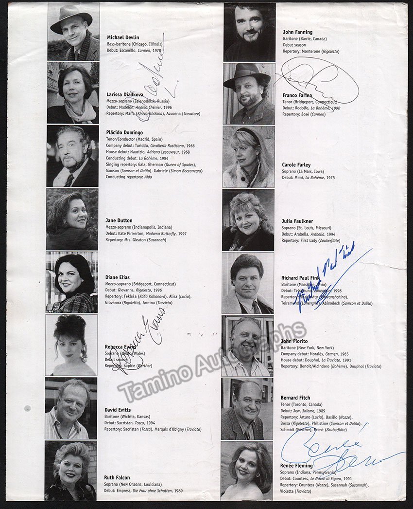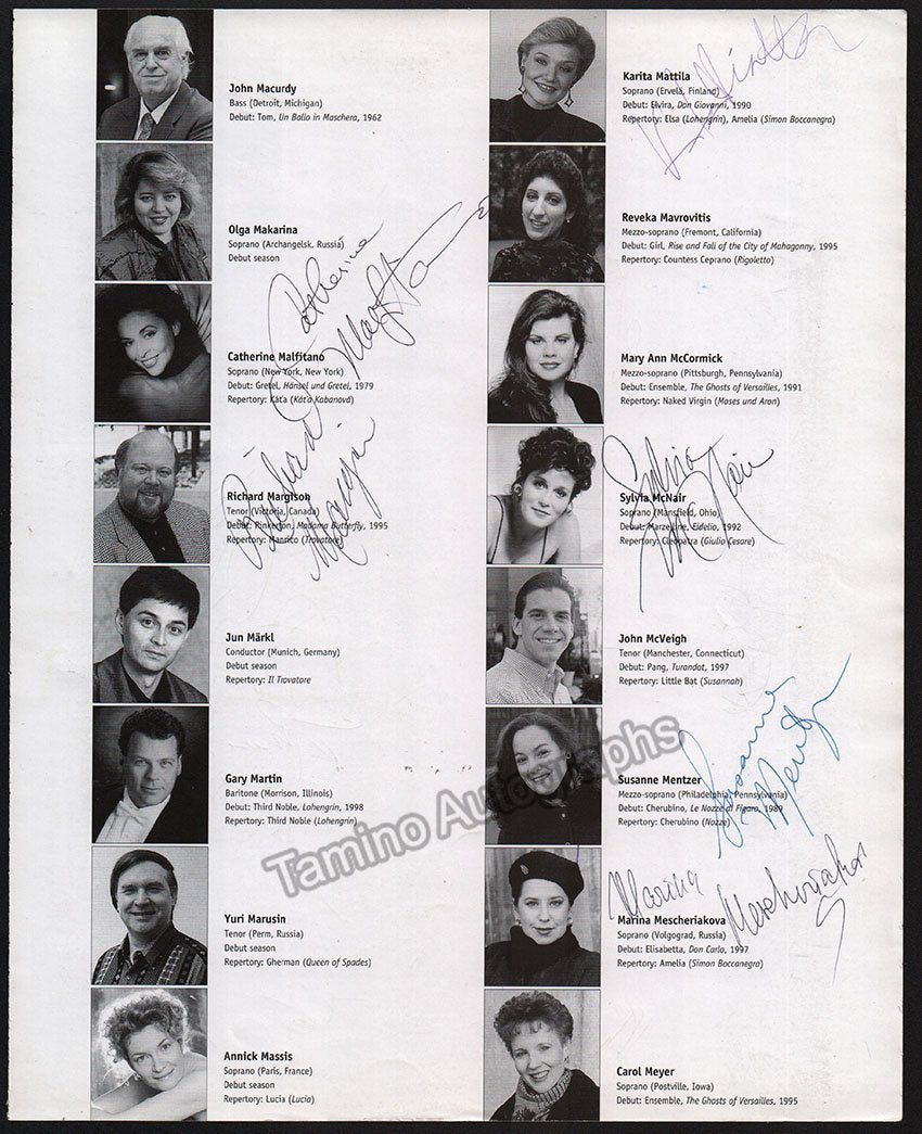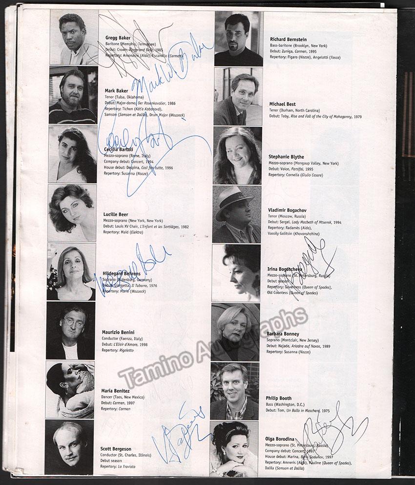 Full book for the 1998-1999 Season at the Metropolitan Opera, New York, 112 pages, with color illustrations and articles. Multiples signatures on the artists roster including Dmitri Hvorostovsky, John Tomlinson, Fabio Armiliato, Marcelo Alvarez, Cecilia Bartoli, Hildegard Behrens, Olga Borodina, Renee Fleming, Valery Gergiev, Susan Graham, Nathan Gunn, Thomas Hampson, Ben Heppner, Richard Leech, Sergei Leiferkus, Catherine Malfitano, Richard Margison, Sylvia McNair, Karita Mattila, Rene Pape, Juan Pons, Elisabeth Soderstrom, Bryn Terfel, Dawn Upshaw, Carol Vaness, Ramon Vargas, Deborah Voigt and many others.  Size is 9 x 11,25 inches, soft covers, some loose pages, otherwise in excellent condition.