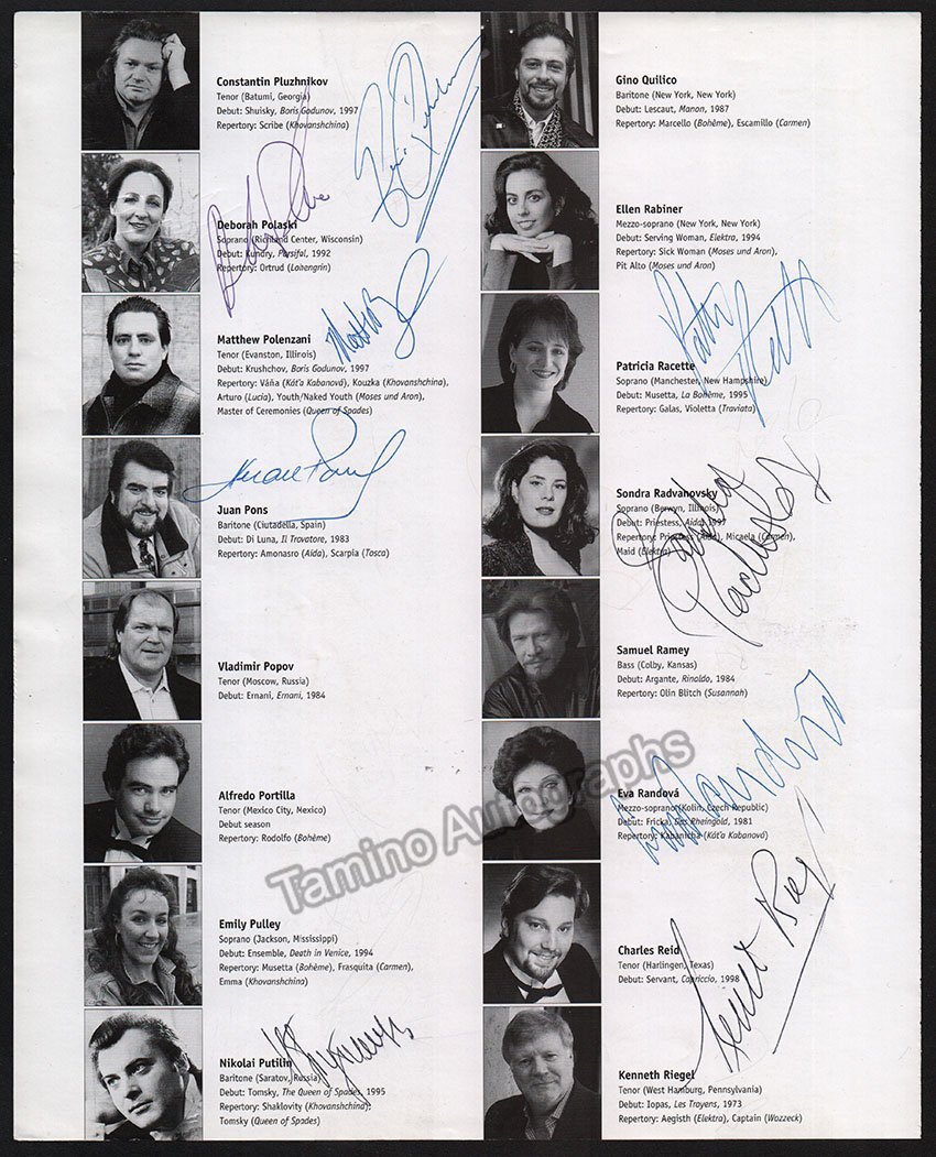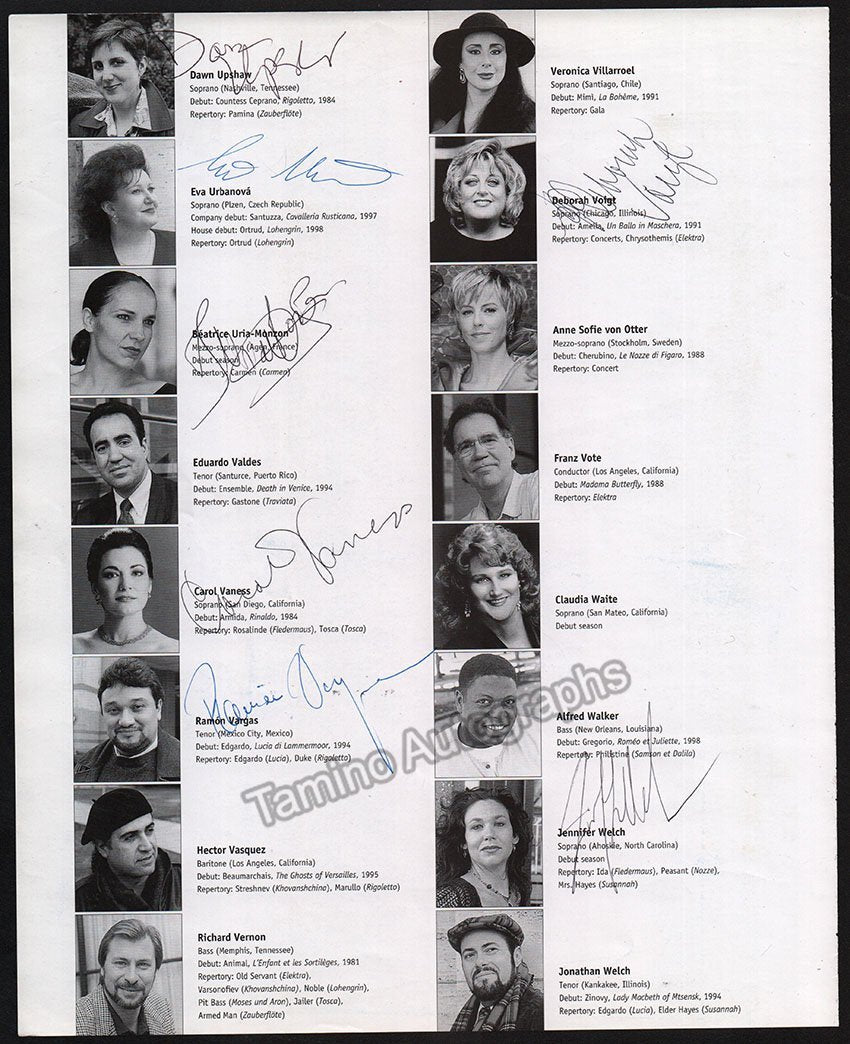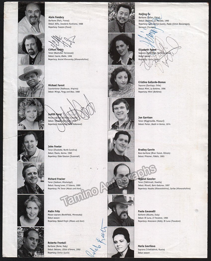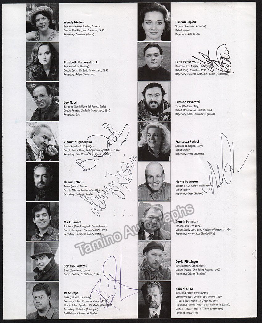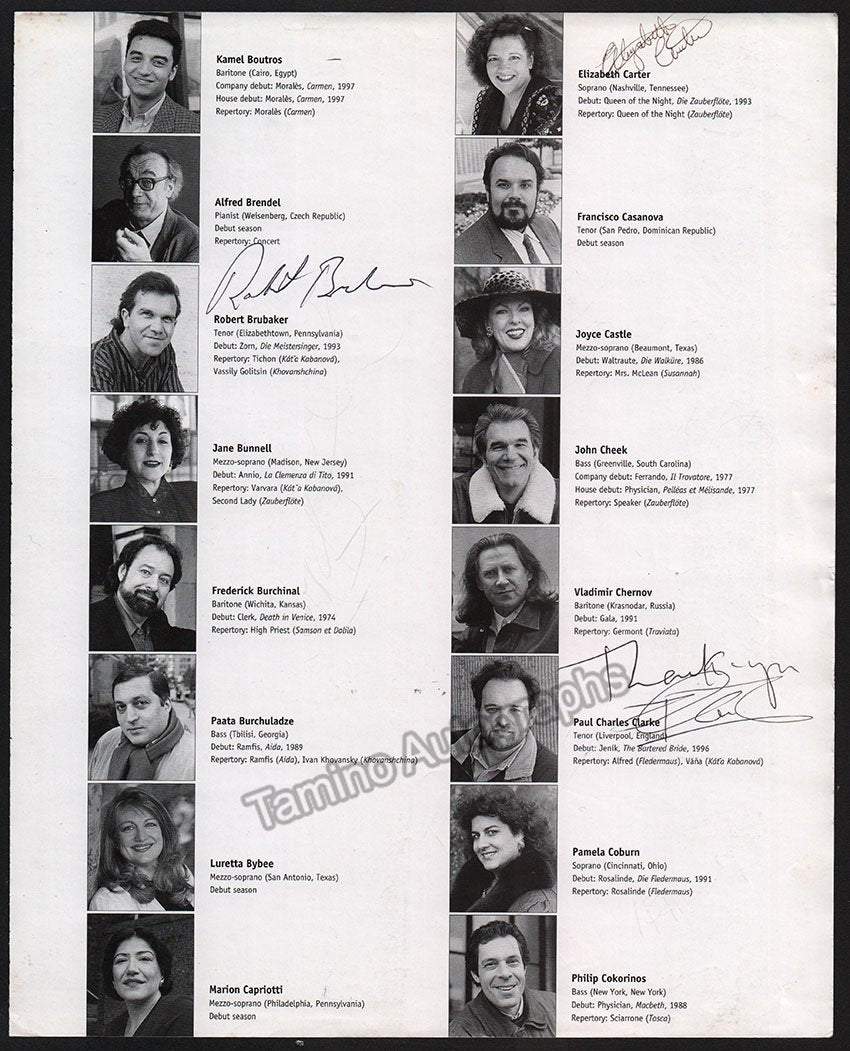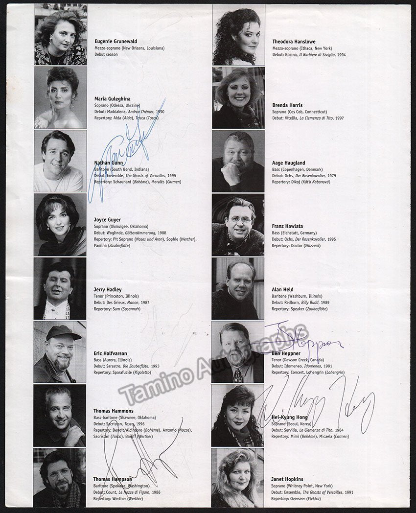Full book for the 1998-1999 Season at the Metropolitan Opera, New York, 112 pages, with color illustrations and articles. Multiples signatures on the artists roster including Dmitri Hvorostovsky, John Tomlinson, Fabio Armiliato, Marcelo Alvarez, Cecilia Bartoli, Hildegard Behrens, Olga Borodina, Renee Fleming, Valery Gergiev, Susan Graham, Nathan Gunn, Thomas Hampson, Ben Heppner, Richard Leech, Sergei Leiferkus, Catherine Malfitano, Richard Margison, Sylvia McNair, Karita Mattila, Rene Pape, Juan Pons, Elisabeth Soderstrom, Bryn Terfel, Dawn Upshaw, Carol Vaness, Ramon Vargas, Deborah Voigt and many others.  Size is 9 x 11,25 inches, soft covers, some loose pages, otherwise in excellent condition.
