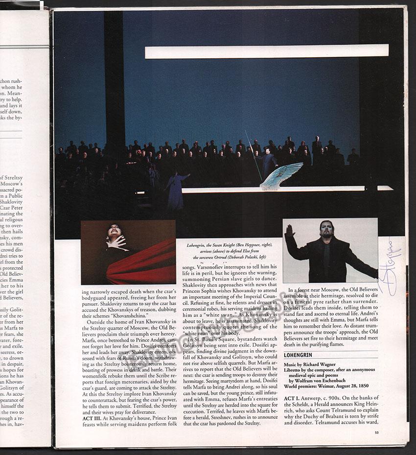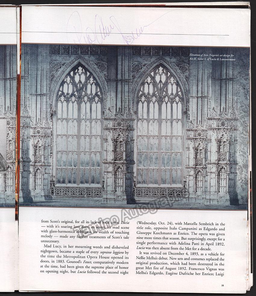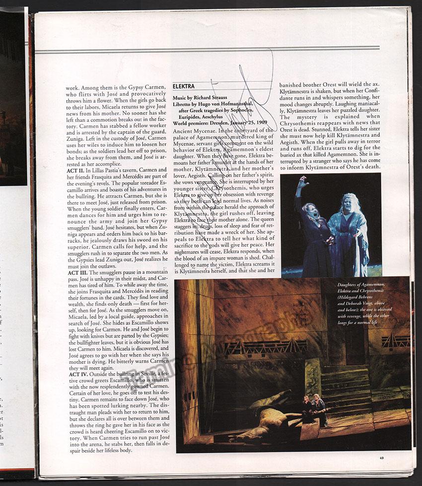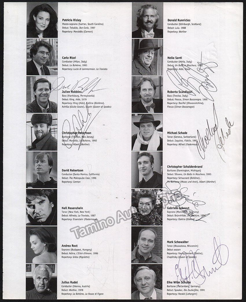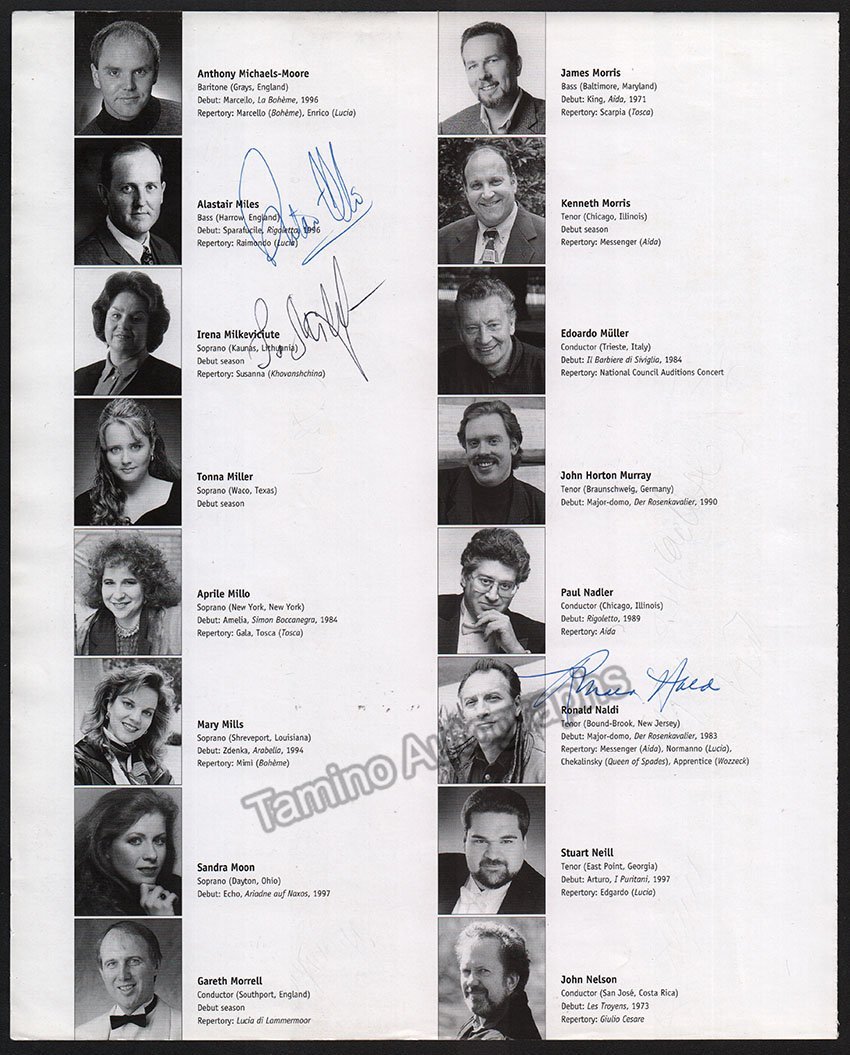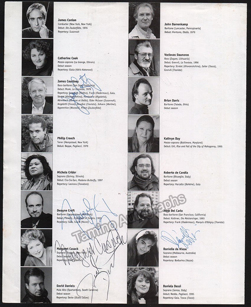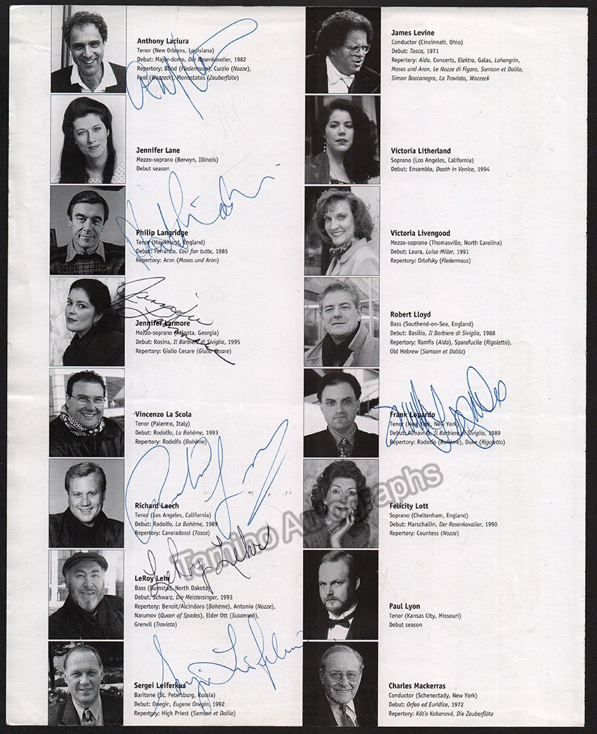 Full book for the 1998-1999 Season at the Metropolitan Opera, New York, 112 pages, with color illustrations and articles. Multiples signatures on the artists roster including Dmitri Hvorostovsky, John Tomlinson, Fabio Armiliato, Marcelo Alvarez, Cecilia Bartoli, Hildegard Behrens, Olga Borodina, Renee Fleming, Valery Gergiev, Susan Graham, Nathan Gunn, Thomas Hampson, Ben Heppner, Richard Leech, Sergei Leiferkus, Catherine Malfitano, Richard Margison, Sylvia McNair, Karita Mattila, Rene Pape, Juan Pons, Elisabeth Soderstrom, Bryn Terfel, Dawn Upshaw, Carol Vaness, Ramon Vargas, Deborah Voigt and many others.  Size is 9 x 11,25 inches, soft covers, some loose pages, otherwise in excellent condition.