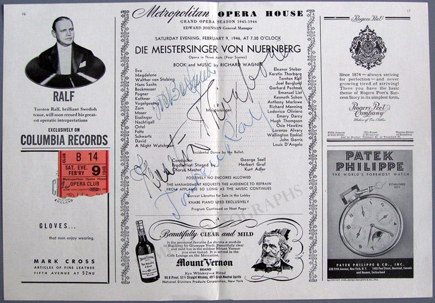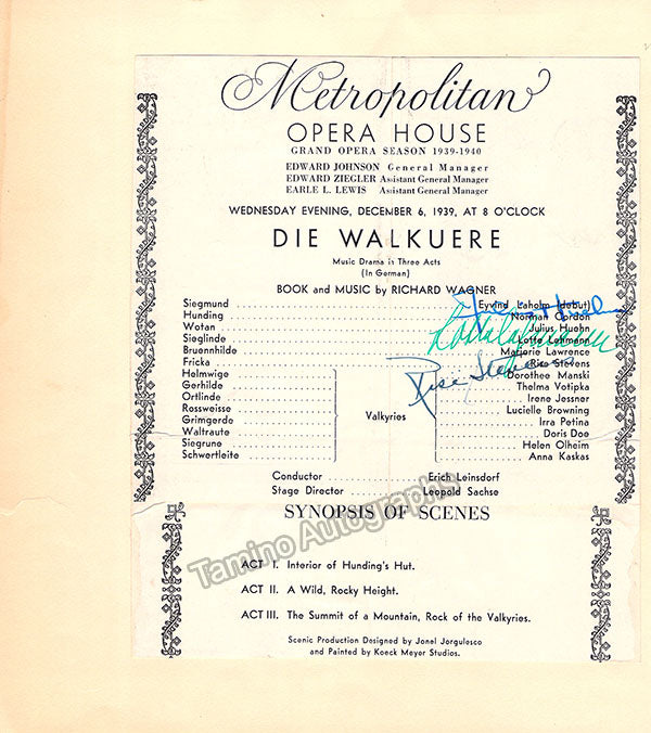 Clip from a program for a performance of 'Die Walkure' signed by Lehmann, Stevens, and Julius Kuehn at The Met Opera, on December 16, 1939, mounted on an album page. Total size is 7.9 x 8.9 inches, in excellent condition.