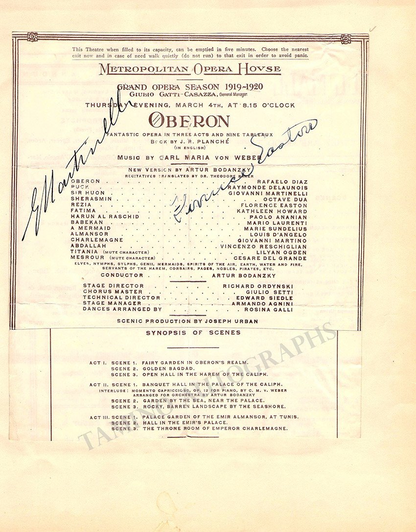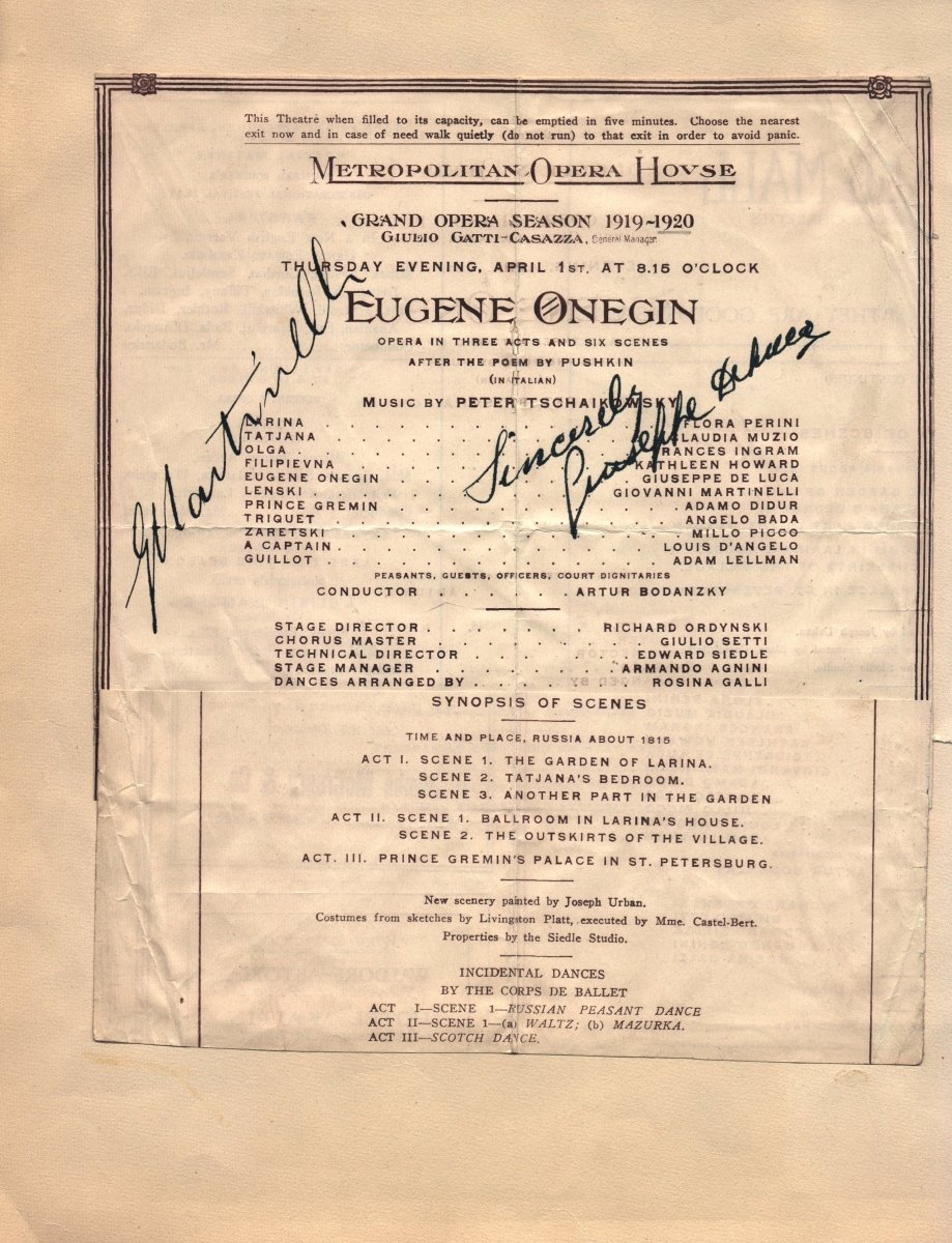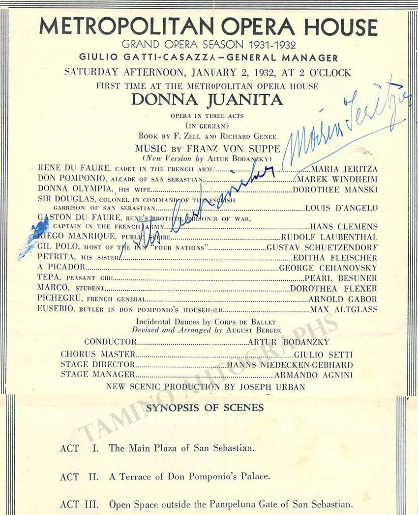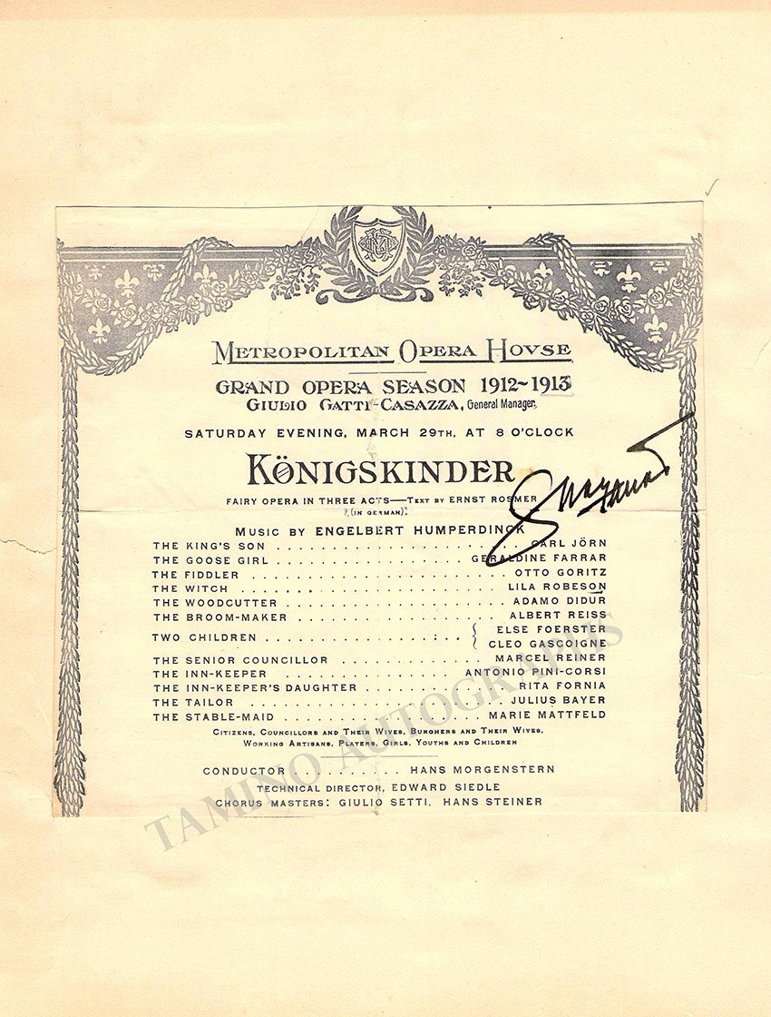 Program clip mounted on an album page for a performance of Verdi's Aida at The Met on February 24, 1931, signed by him and by soprano Gertrude Kappel on the back. Total size is 8.1 x 6.2 inches, central fold, cracks, in good condition.
