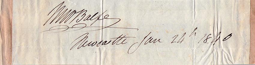 Signed fragment from a document, dated by him in Newcastle, 1840. Size is 8.5 x 2.25 inches, in very good condition.
