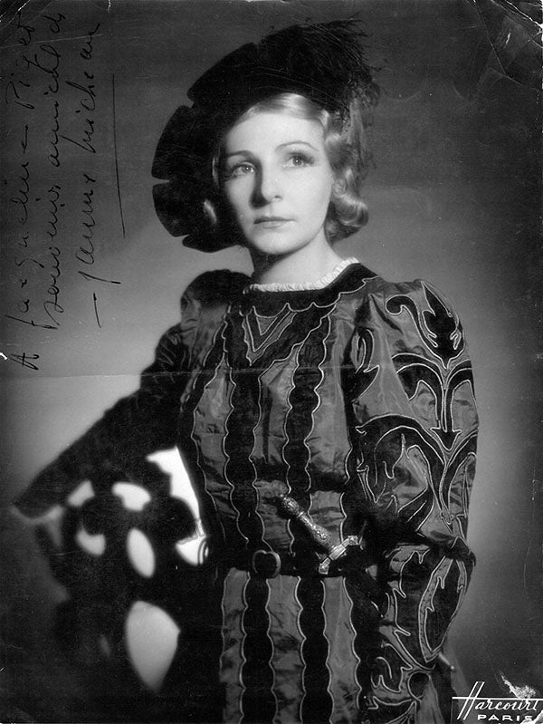 French soprano (1914-1976), signed photograph, shown in role, inscribed. Photo by Harcourt, Paris. Size is 7 x 9.5 inches, with slight creases and paper loss on edges, otherwise in excellent condition.