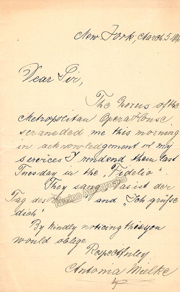 German soprano (1852 -1907), first known for coloratura roles, but eventually most celebrated in more dramatic repertoire. Autograph note signed, 1 page written in English, dated in New York in 1891. Size is 4.5 x 7 inches, in excellent condition.