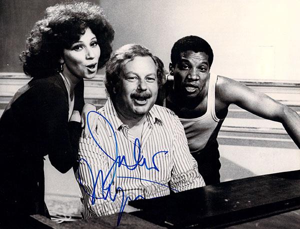 Signed photo, shown as herself in rehearsal with Hans Hammerschmidt and John Maddel. Size is 6.5 x 8.5 inches, in excellent condition.