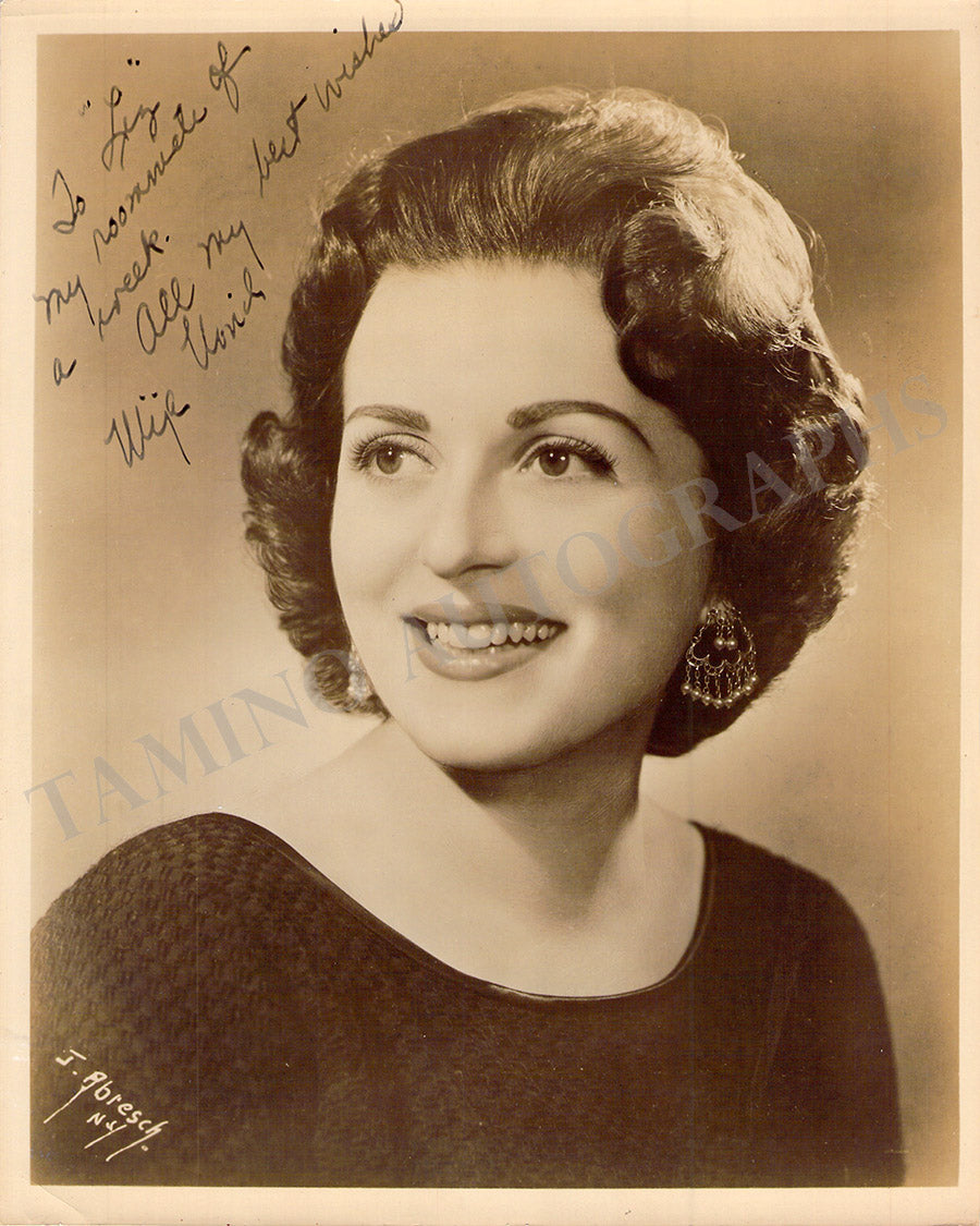Black-and-white photograph signed and inscribed by her with a short sentiment. Size is 7.9 x 9.9 inches, in excellent condition.