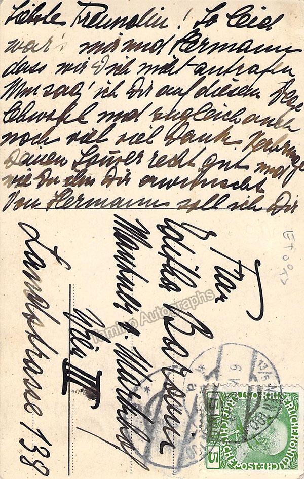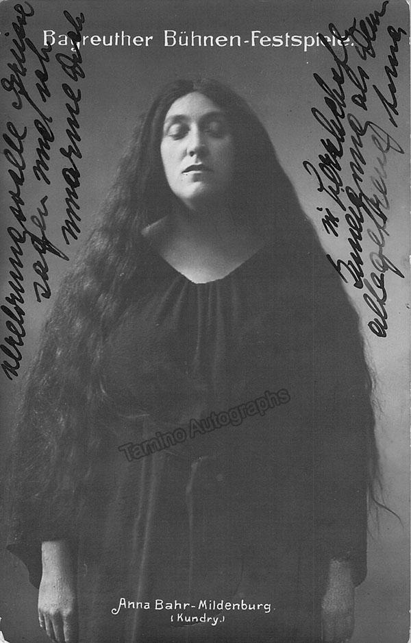 Austrian Soprano (1872-1947), previously known as Anna Von Mildenburg before her 1907 marriage. Signed photo postcard, shown as Kundry in Wagner's Parsifal at the Bayreuth Festival, signed and inscribed on front as "Anna", with more extensive inscription on verso. Size is 3.5 x 5.5 inches, in excellent condition.