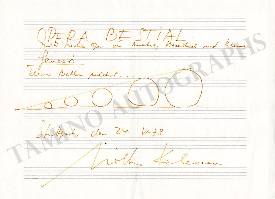 Autograph music quote on a music sheet with a graphic crescendo of the first movement "Genesis" from his work "Opera Bestial" signed by him and dated in Stuttgart on June 24, 1978.  Size is 8 x 5.7 inches, in excellent condition.