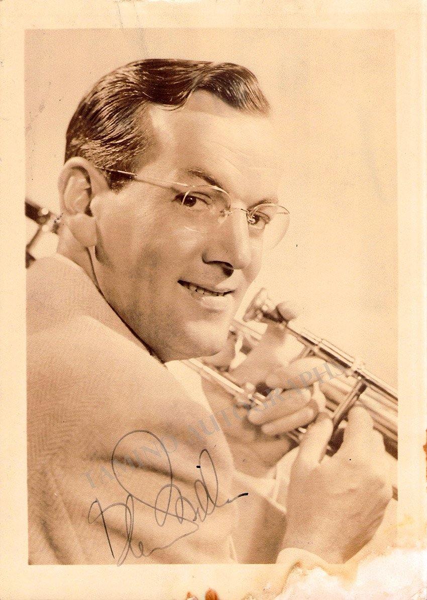 American big-band trombonist (1904-1944), arranger, composer, and bandleader of the swing era.  Signed photograph shown with his trombone.  Size is 5 x 7 inches, some water damage over the lower-right corner, not affecting signature; in good condition.