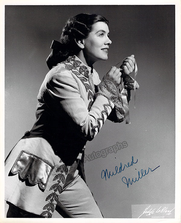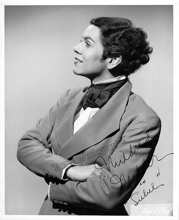 Signed photograph, shown as Siebel in Gounod's Faust. Stamped on verso by photographer Sedge LeBlang, Metropolitan Opera, New York. Size is 8 x 10 inches, several creases on left edges, otherwise in very good condition.