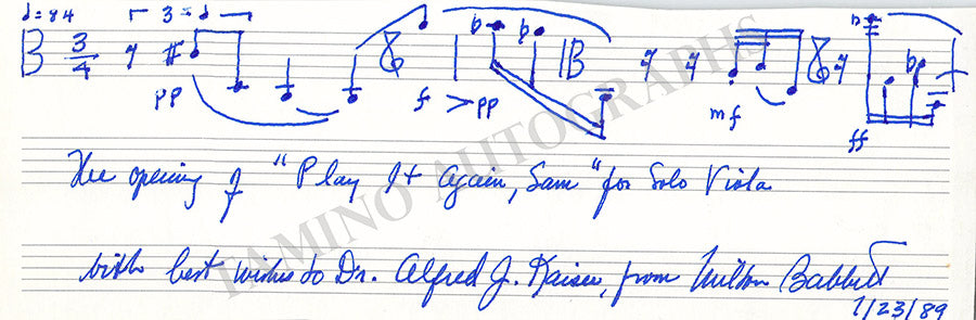 Fine 2-bar autograph music quote from his Play it Again, Sam for solo viola signed and inscribed by him with a short sentiment dated on January 23, 1989. Size is 8.4 x 2.75 inches, in excellent condition.