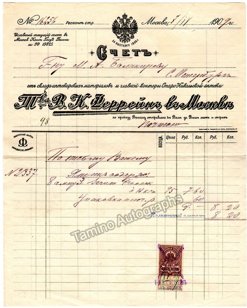 Autograph letter signed, dated in 1909, asking a friend to go to the pharmacy for medicine for him, and stating how hard it has been to get his prescription filled. Also included is the prescription. Autograph letter is one page, 4.5 x 7.5 inches, in Russian, sold untranslated, has a small repair, otherwise in very good condition. Prescription is 8.75 x 11 inches, in excellent condition.