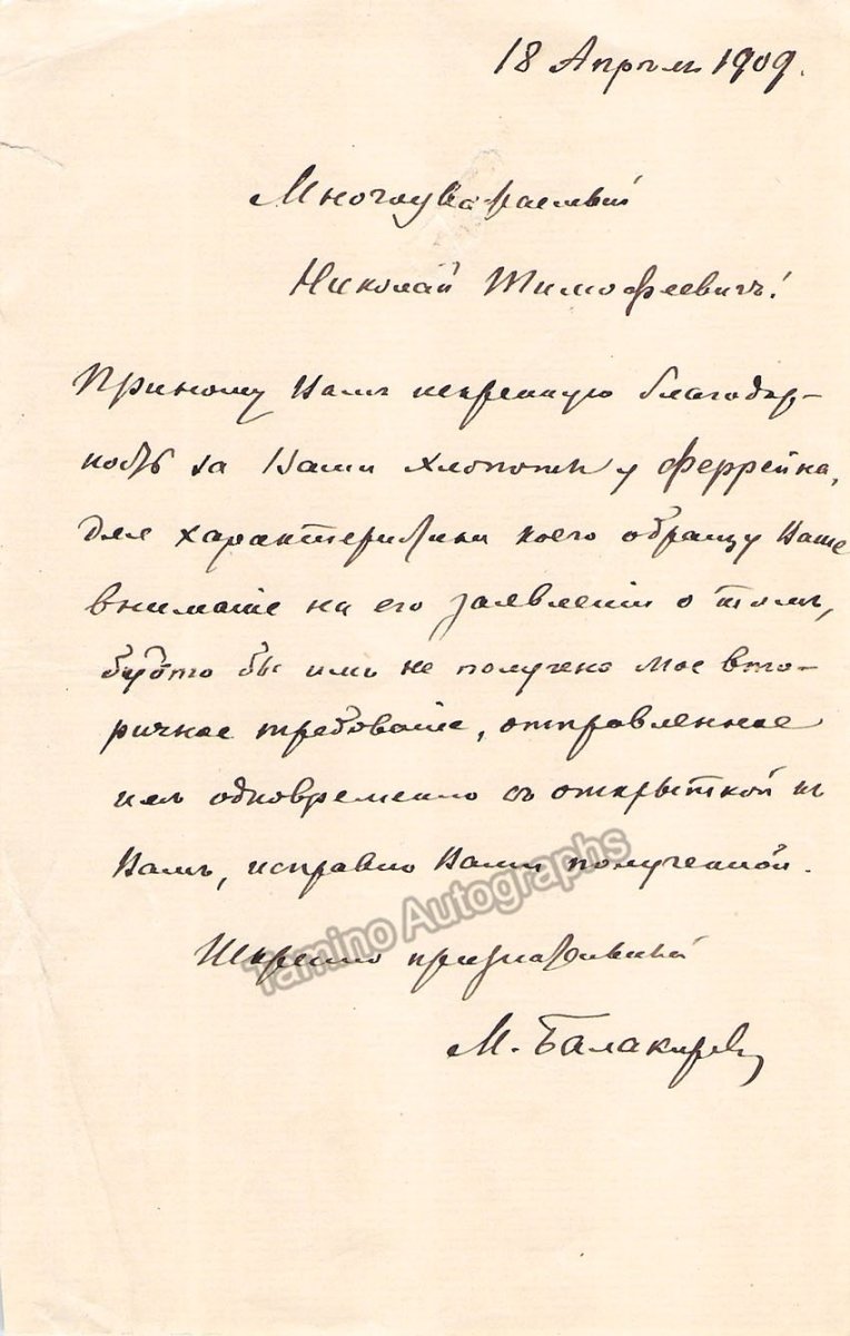 Balakirev, Mily - Autograph Letter Signed 1909 - Tamino Balakirev, Mily - Autograph Letter Signed 1909 - Tamino