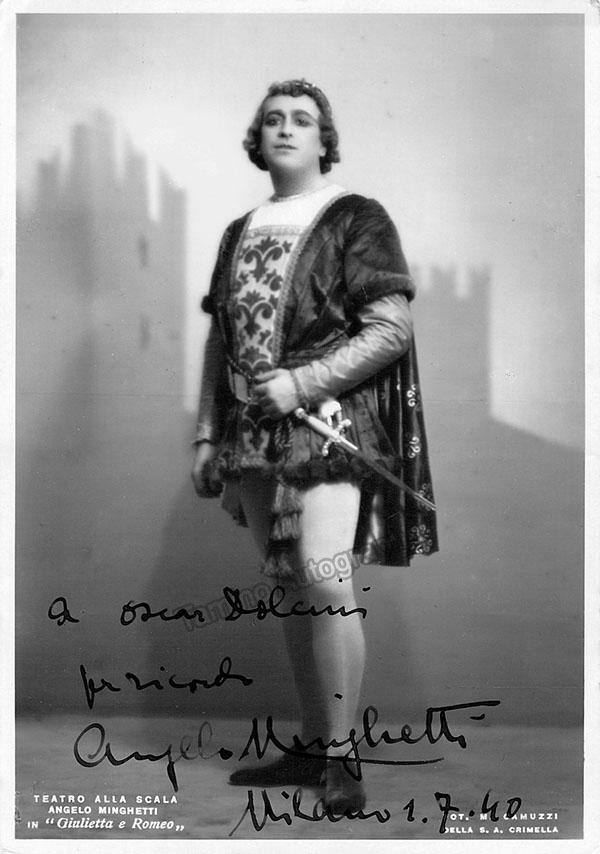 Italian tenor (1889-1957), signed photo postcard, shown as Romeo in Gounod's Romeo et Juliette at La Scala Milan, dated in 1940. Photo by M. Camuzzi, Milan. Size is 4.1 x 5.9 inches, some wear on edges but otherwise in very good condition.