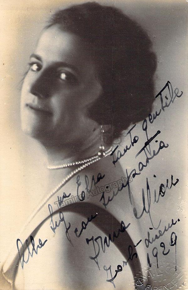 Italian soprano (1890-?), signed vintage photo postcard, shown as herself, inscribed with brief sentiment, dated in 1929. Blind stamped by photographer T. Locchi, Florence. Size is 3.5 x 5.25 inches, in excellent condition.