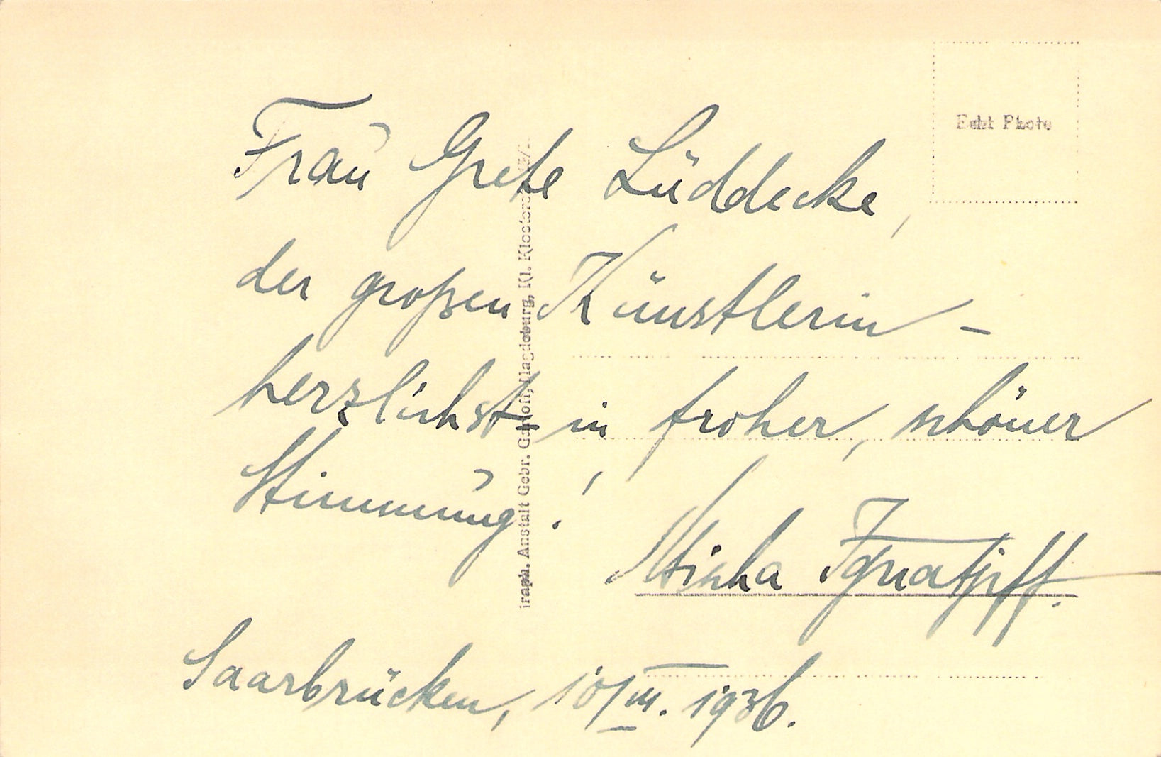 Fine black-and-white photo postcard signed by him with a short sentiment dated 1936. Size is 3.6 x 5.5 inches, in excellent condition.